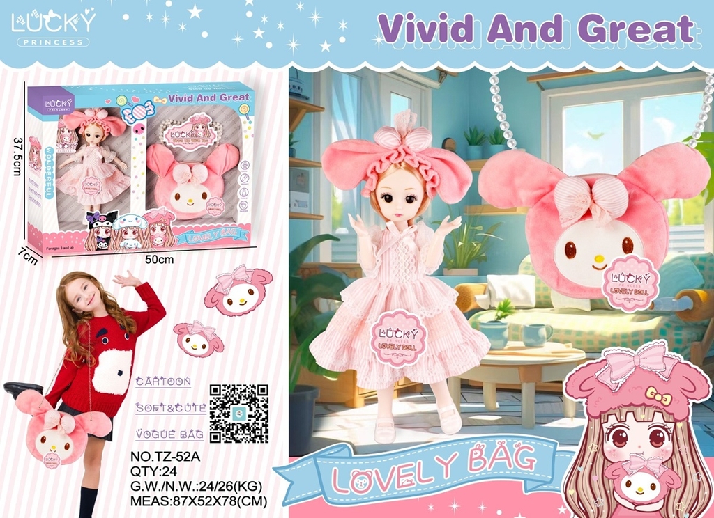 TZ-52A HỘP BABY 1C KHỚP, MẮT THỦY TINH + 1C GIỎ XÁCH SANRIO